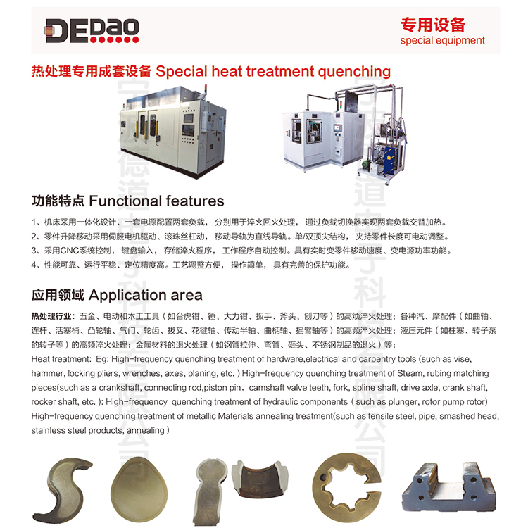 各類五金工具、電動(dòng)、液壓、氣動(dòng)元件、汽、摩配等機(jī)械金屬部件的表面、內(nèi)孔、局部或整體淬火。如:錘、刀、剪、鉗及各類軸、凸輪、鏈輪、齒輪、氣門、球頭銷、大型機(jī)床導(dǎo)軌、球墨鑄鐵的淬火。